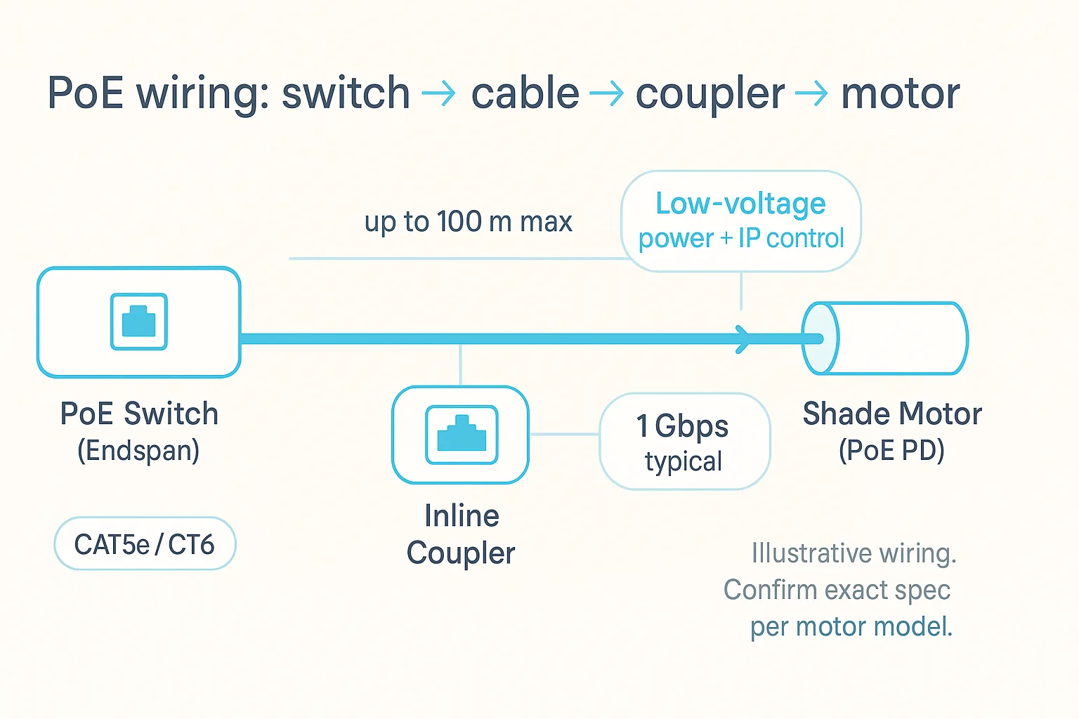 Power over Ethernet (PoE) sends low-voltage power and IP control through the same CAT cable. Your PoE switch (endspan) supplies power; the motor receives both power and commands via Ethernet. With Matter, the shades join your smart home using a compatible hub for quick, local automations.